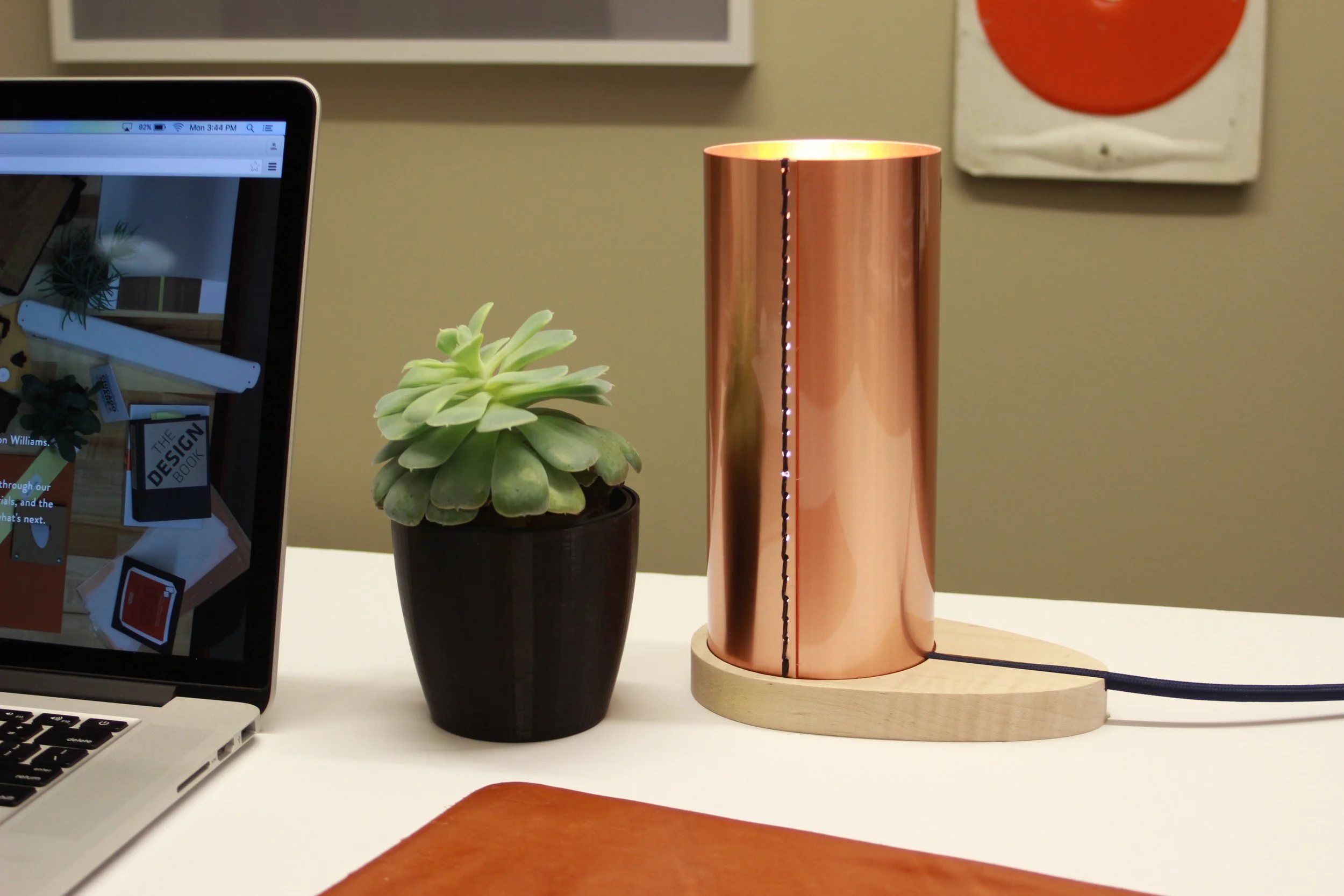 Cylindrical desk lamp in copper and flame maple designed by Pam Daniels and Brandon Williams for Inventables, Inc.