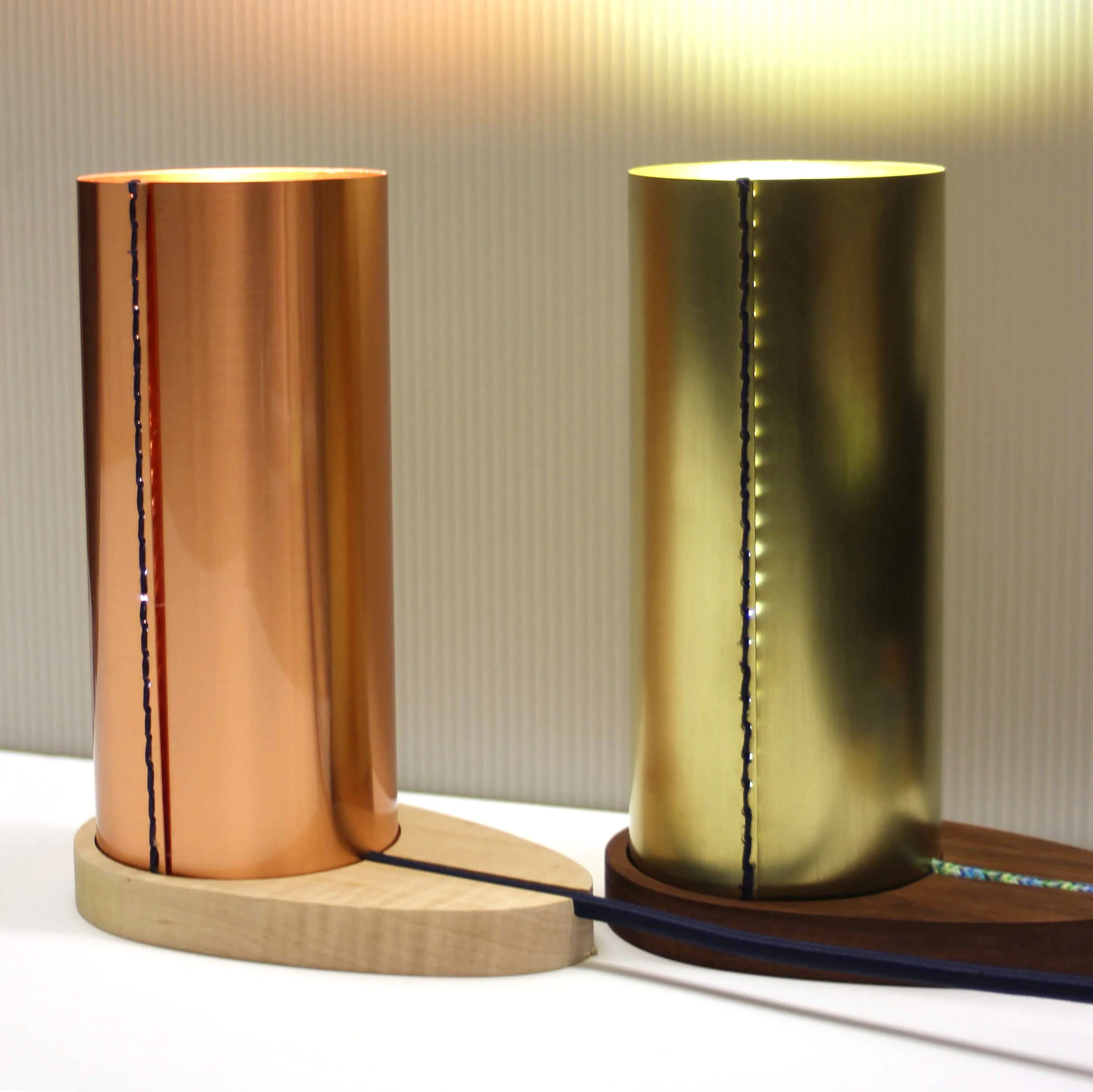 Cylindrical desk lamps fabricated two ways: copper with a flame maple base, and brushed brass with a walnut base.