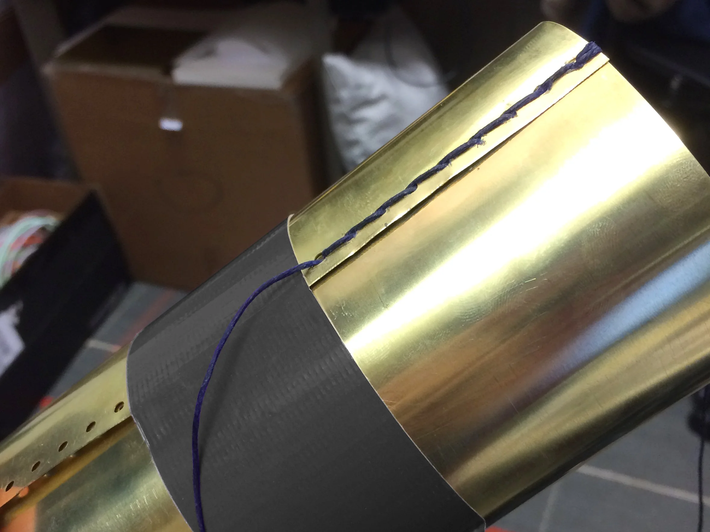 Waxed cotton polycord saddle stitch on the brass cylinder