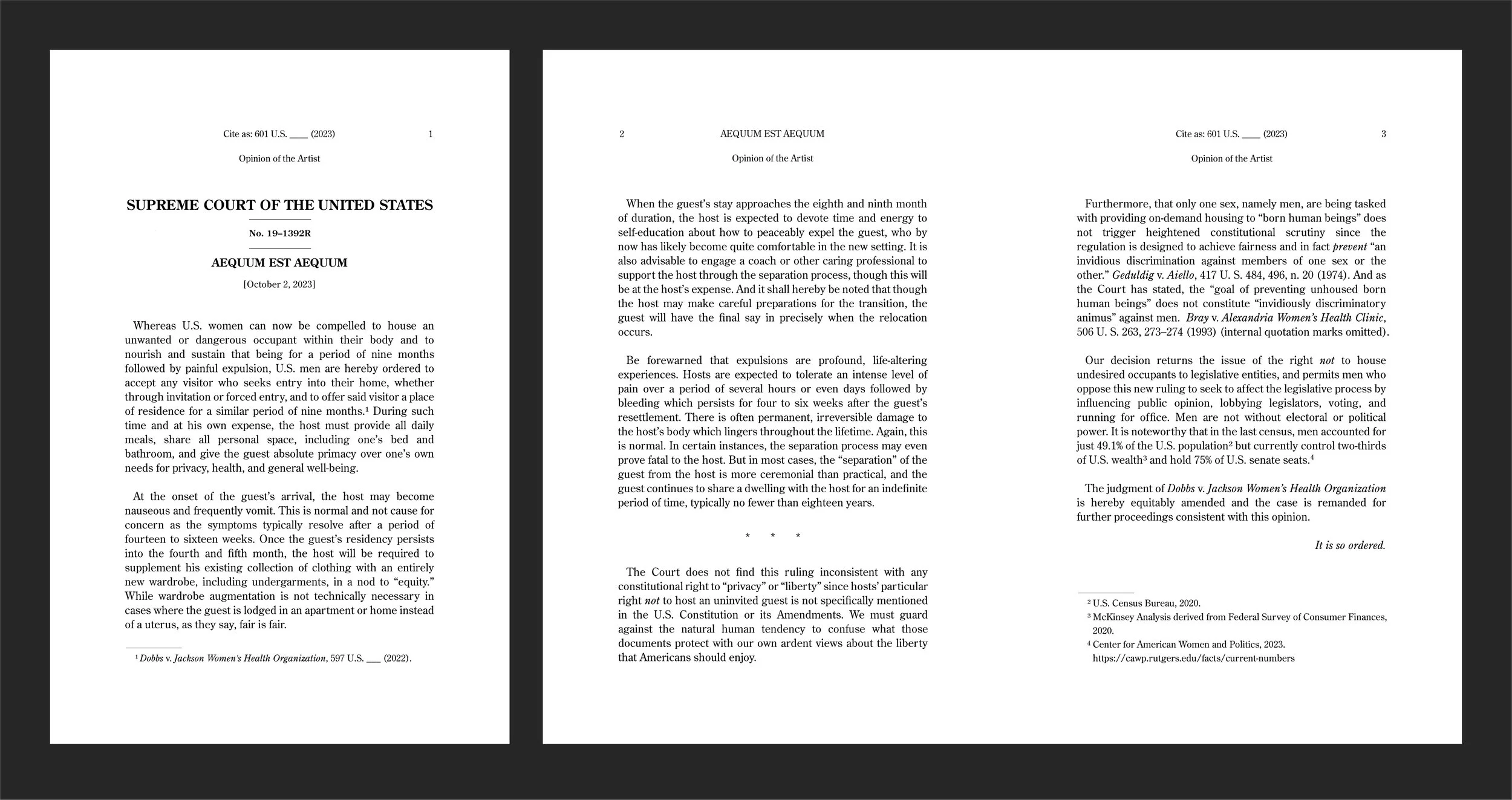 The formatting of both elements strictly adheres to the typeface and formatting requirements of Supreme Court documents but offers the Opinion of the Artist rather than the Opinion of the Court. In this provocative mock ruling, men are compelled to offer housing to anyone who desires to share their residence. The piece begins with the following statement: